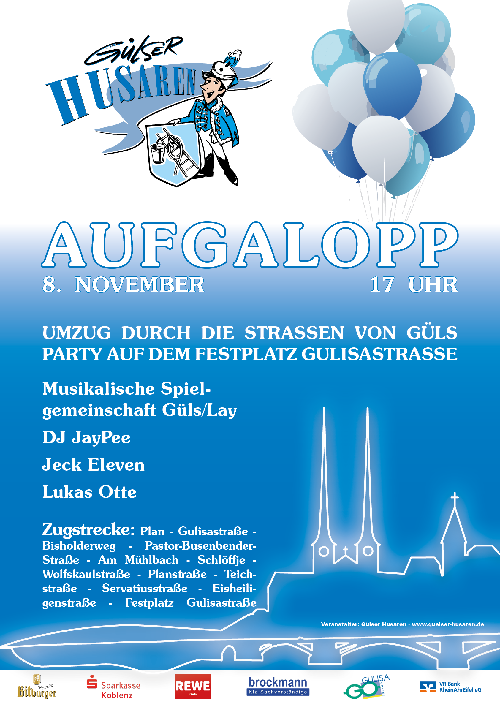 Die Zugstrecke wird vom Plan, durch die Gulisastraße, Bisholderweg, Pastor-Busenbender-Straße, Am Mühlbach, Schlöffje, Wolfskaulstraße, Planstraße, Teichstraße, Servatiusstraße, Eisheiligenstraße zum Festplatz in der Gulisastraße führen. Wir freuen sich, wenn alle Anwohner ihre Häuser schmücken und ganz Güls in eine blau-weiße Husarenarena verwandeln.
