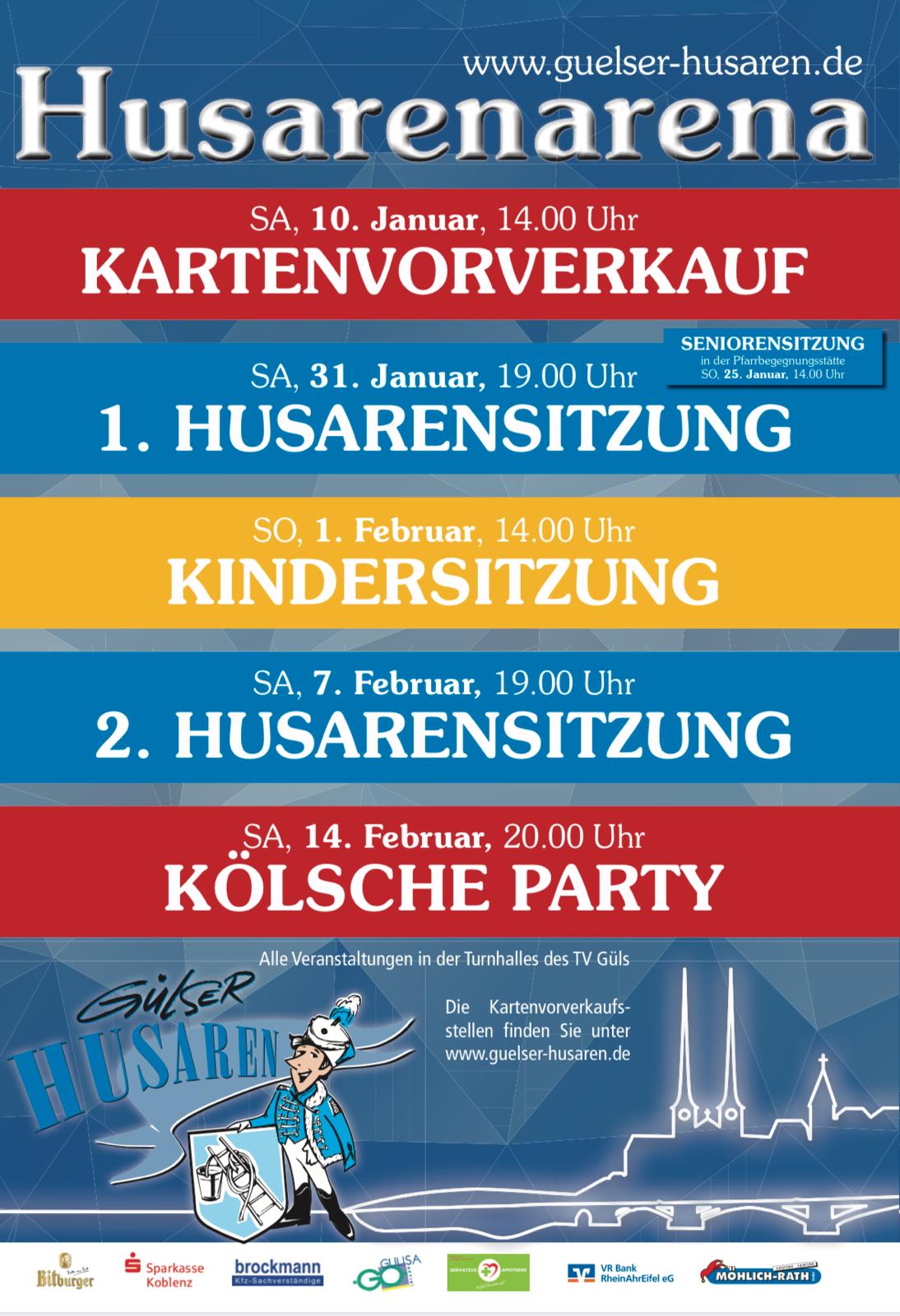 Am 10. Januar 2026 starten wir den Kartenvorverkauf für die beiden Prunksitzungen am 31. Januar und 7. Februar 2026 in der Husarenarena, der Turnhalle des TV Güls. Wer die Chance auf gute Plätze erhöhen möchte, sollte am 10. Januar 2026 um 14.00 Uhr in das Restaurant Turnerheim, Eisheiligenstraße 2 in Koblenz-Güls kommen. Wie in den vergangenen Jahren werden die Karten nach dem bewährten Losverfahren verkauft.