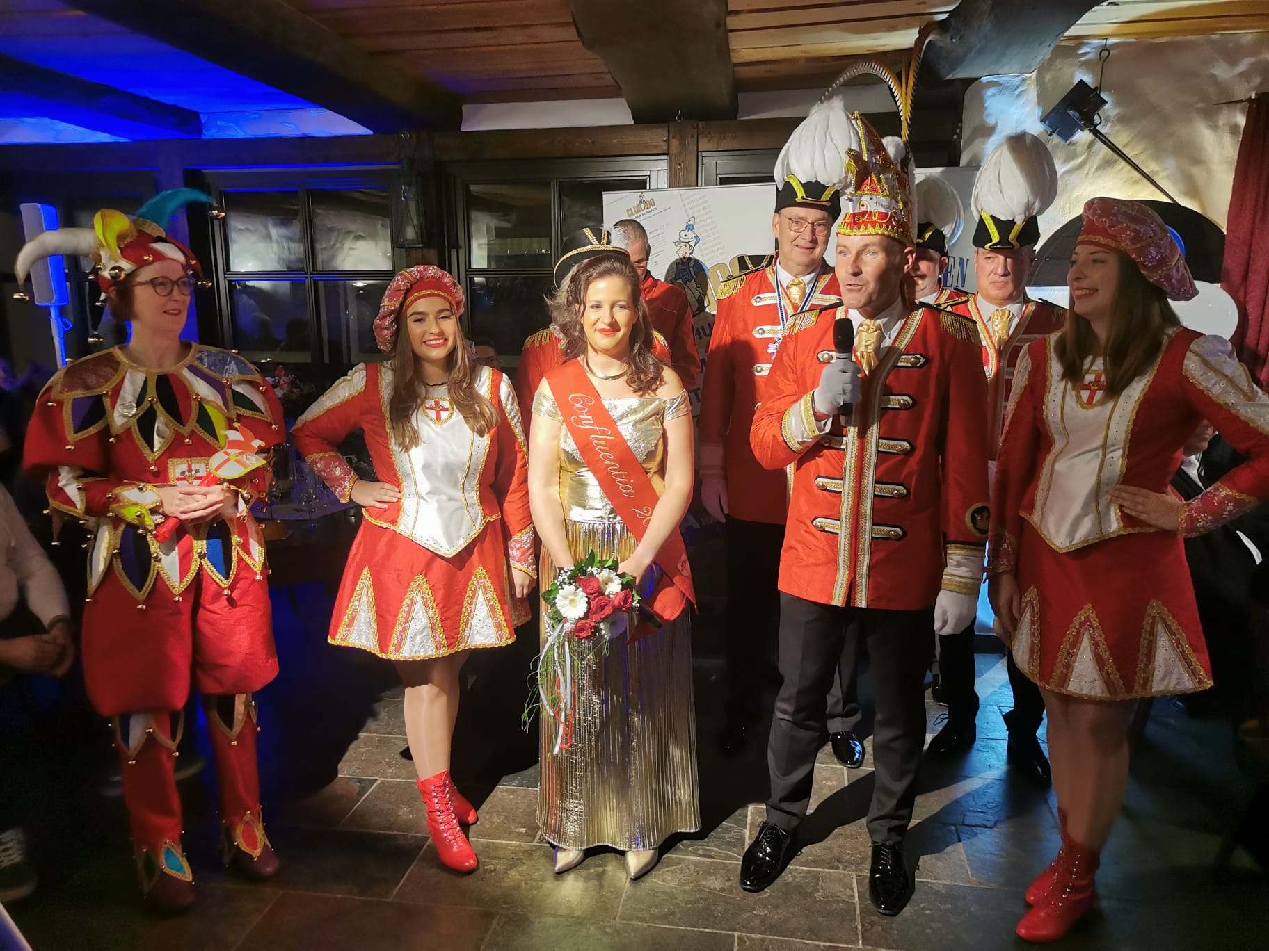 Die designierten Tollitäten Prinz Dirk, der Vollblut-Geck mit Liebe zum Eck und Confluentia Jenni mit ihrem Hofstaat der Arbeitsgemeinschaft Koblenzer Karneval (AKK), gaben sich auch die Ehre, um dem neuen Ehrenhusaren gebührend zu gratulieren.